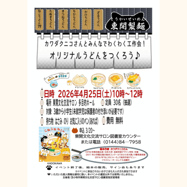 【4月のイベント】カワダクニコさんとみんなでわくわく工作会!オリジナルうどんをつくろう♪