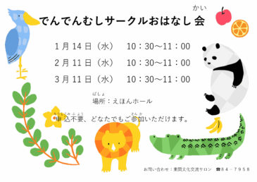 2025.12.13 図書室 イベント 【1月のイベント】でんでんむしサークルおはなし会 月第2水曜日の午前中に開催の「でんでんむしサークルさん」のおはなし会。今月はどんなお話しがきけるかな? 日 時:1月14日(水)10:30~11:00 場 所:えほんホール 対 象:どなたでも 参加費:無料 *申込不要