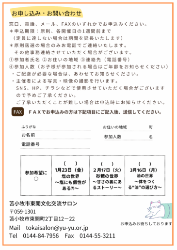 *サロンイベントの撮影について:主催者による写真・映像の撮影を行います。SNS、HP、チラシなどで使用させていただく場合がございますので予めご了承ください。ご承諾いただくことが難しい場合は申込時にお知らせください。