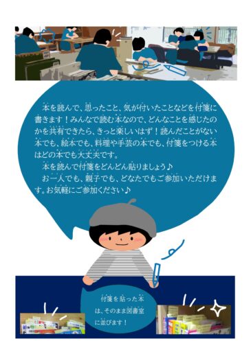 本を読んで、思ったこと、気が付いたことなどを付箋に書きます!みんなで読む本なので、どんなことを感じたのか共有できたら、きっと楽しいはず!読んだことのない本でも、絵本でも、料理や手芸の本でも、付箋をつける本はどの本でも大丈夫です。本を読んで付箋をどんどん貼りましょう♪お一人でも、親子でも、どなたでもご参加いただけます。お気軽にご参加ください♪
