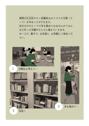 東開文化交流サロン図書室はオリジナル分類(テーマ)を作ることができます。自分だけのテーマで本を集めてみませんか?みんなで作った本棚がどんどん増えていきます。お一人で、親子で、お友達と、お気軽にご参加ください。