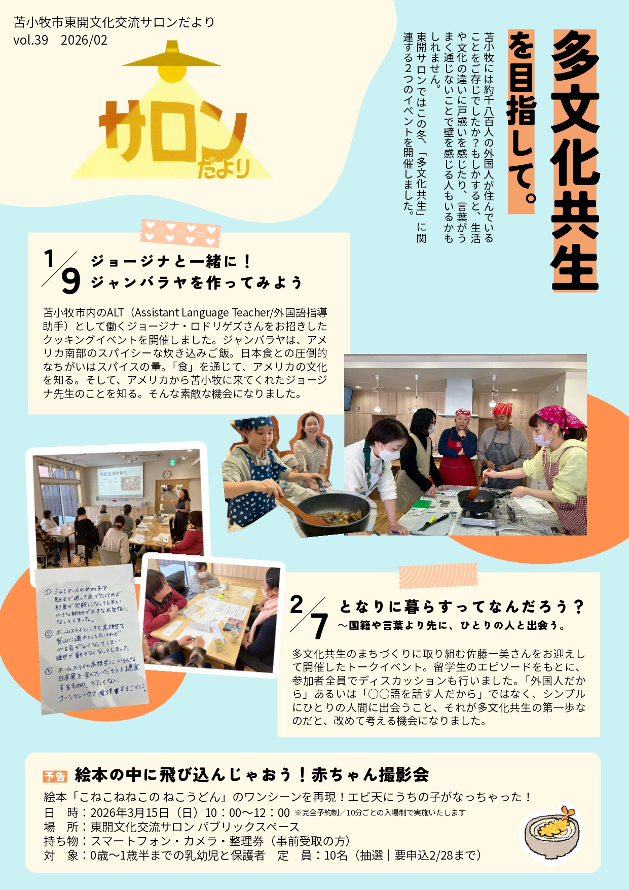 あらゆる市民に開かれた図書室と共生型地域福祉拠点の融合する先進的モデルであるサロンと、それを中核に東開町で展開される「住民同士が自然と気にかけ合う」やさしい文化は、地域を超えて苫小牧市内外からも人を惹きつけ、日々新たな人と人との出会いを生み続ける。そうした営みが続いていく「文化交流サロン」であることを目指します。